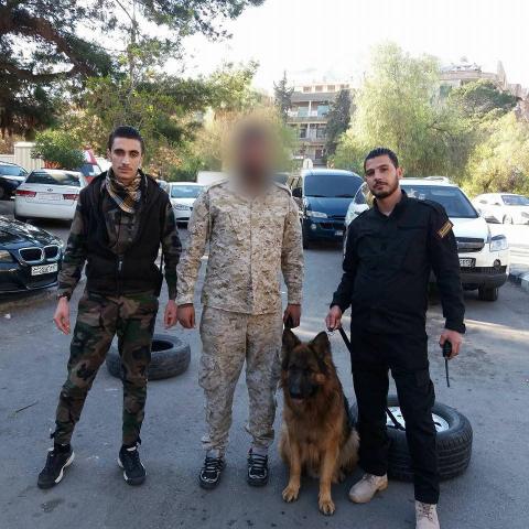 A shabih named as 'Bashar' (center), now in the Netherlands, pictured with a German Shepherd dog and two colleagues at a checkpoint run by Branch 215 in Damascus. Photo from Facebook, 2016